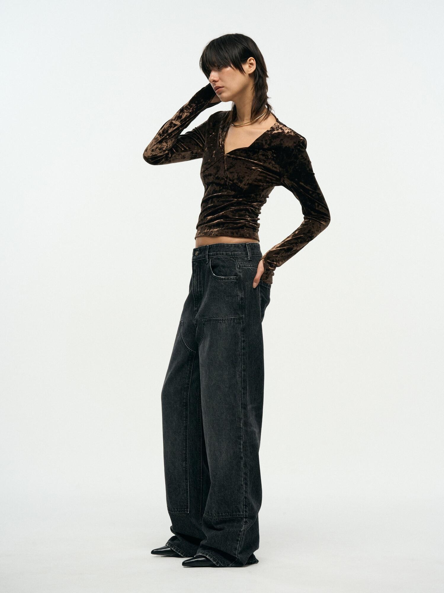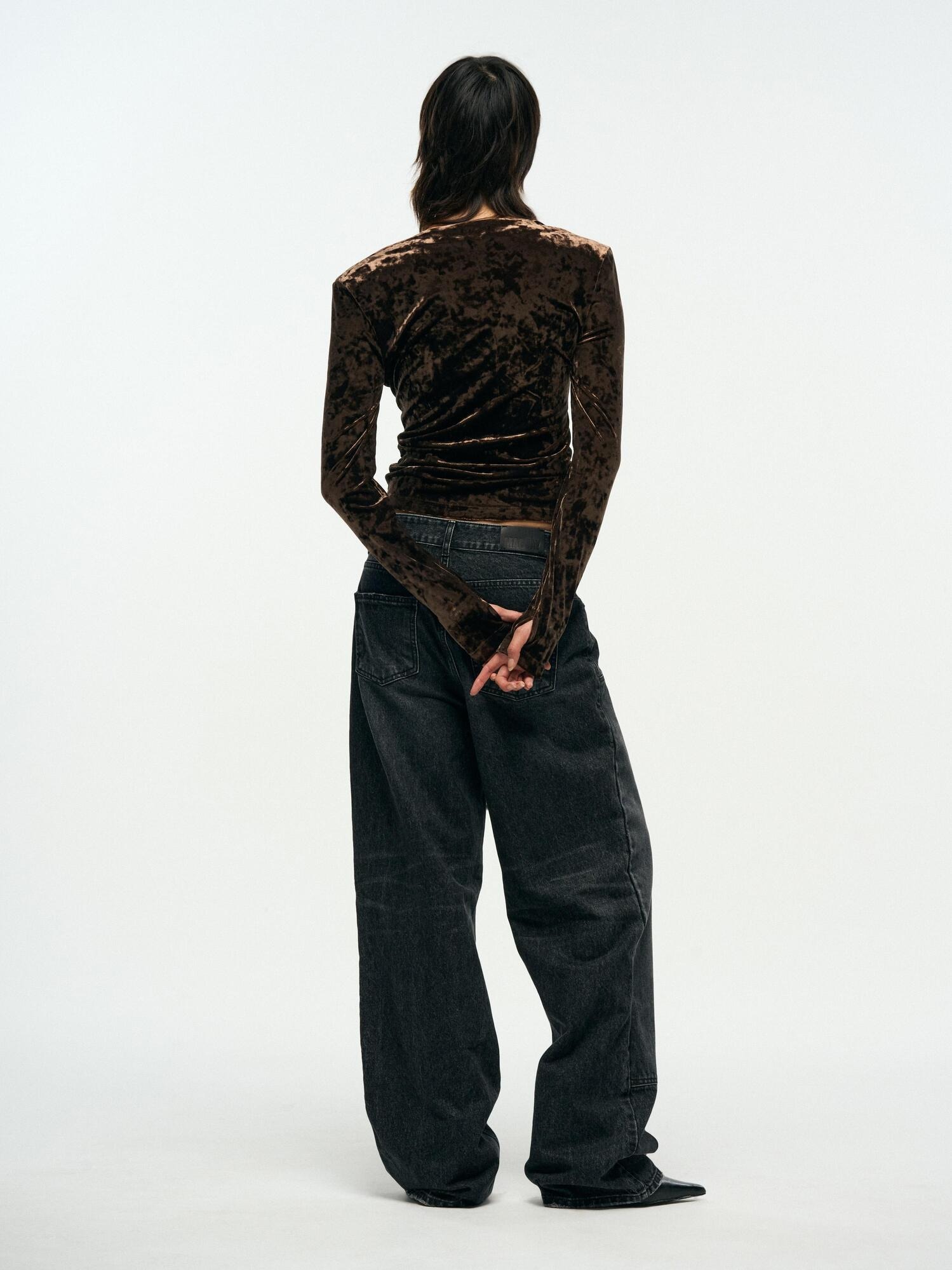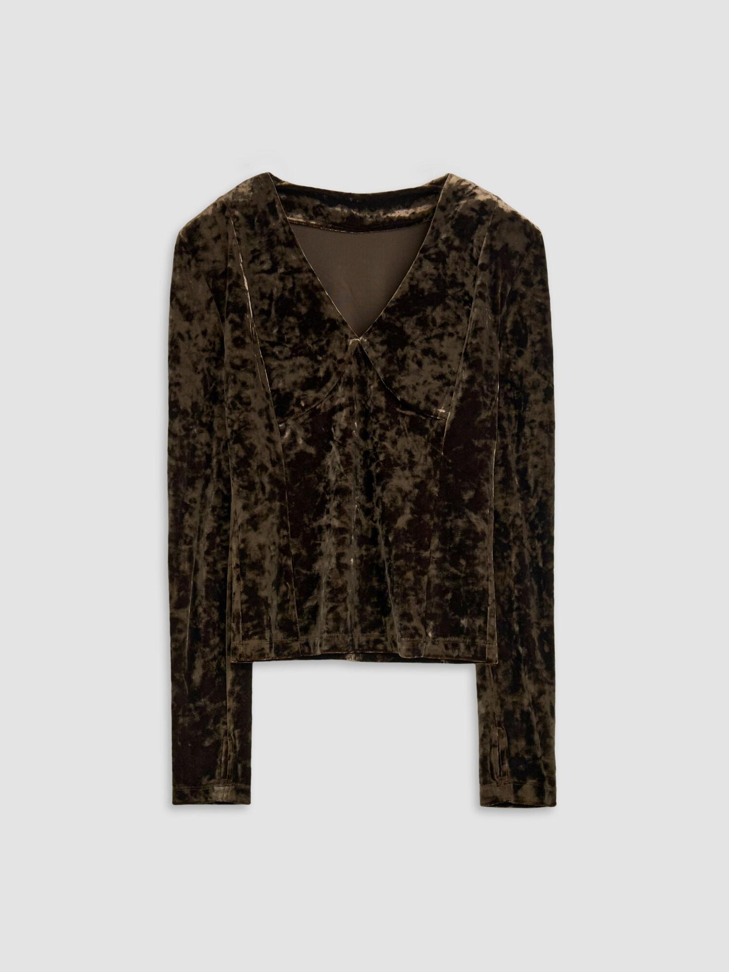 VELVET V-NECK SLIM TOP - BROWN